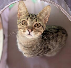 Whyyyyyyy hello! I'm Kida, I'm five months old, and I'm ready to go home with you! My bags are packed. I've got all the essentials: sparkle balls, springs, canned food, feather-on-a-string toys, and, just for good measure, I think I'll add a little bit of whatever you're having for lunch. I'm a bold, curious, cute-as-can-be kitten. A very good girl. A fearsome huntress of things that jingle. And I've waited very patiently for someone to see how stellar I am and choose me! Look, I get it. Tabbies like me don't exactly stand out from the crowd. My section is
