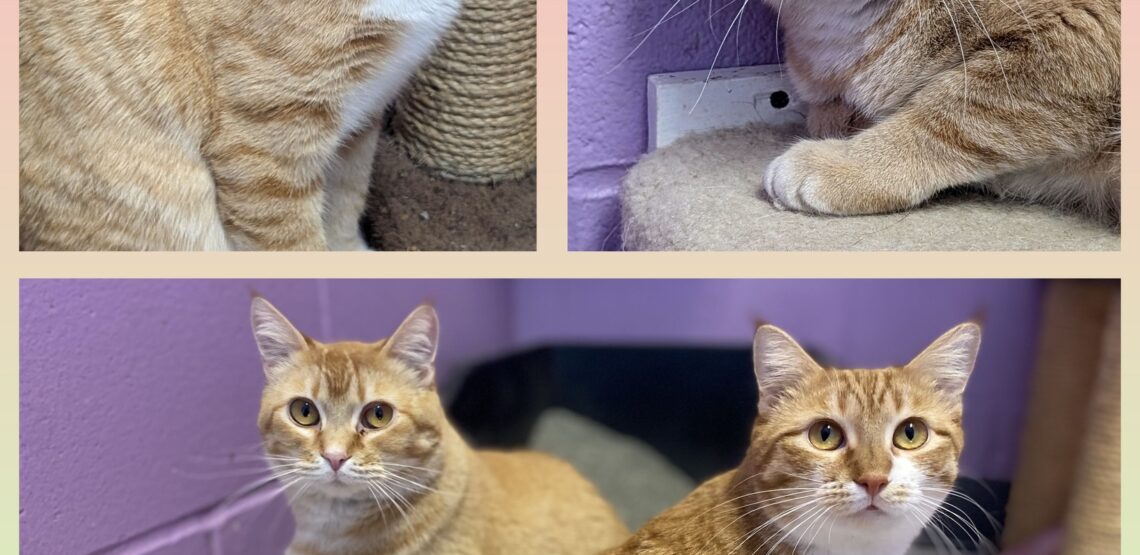 Dream Float is the all-orange one. She’s an unusual “ticked” pattern: she has stripes on her head and legs, but most of her is a soft solid orange! She’s a year and a half old and, like her companion, is a little overwhelmed by shelter life, but really wants love! She will purr, make biscuits, and even roll over for a belly rub once she’s comfortable with you!