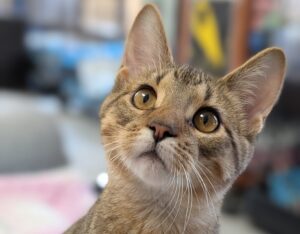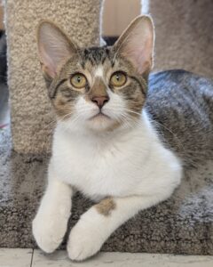 What’s your favorite thing about a kitten? The cuteness? The curiosity? The capers? The cuddliness? Marvin (cafe-au-lait-colored tabby) and Elmer (tabby and white with the little triangle nose) have got all that and more! Marvin is totally fearless and outgoing. Elmer is a little more reserved at first, but comes out of his shell quickly. Both boys are endlessly entertaining and love to wrestle and cuddle with each other. At four months old, they’re not “they would simply pass away from grief if we separated them” bonded, but they are thick as thieves and we’d love to find them a home together if possible. They’ve both been exposed to dogs and neither was too fussed about it. On his first day in the office, Marvin had little kids toting him around like a stuffed animal and he just took it in stride, as he does with most things. These are two seriously excellent kittens and we have no good explanation for why they’re still here. They tick all the boxes. They’re outgoing, adorable, well-behaved, and they love attention. They’re just waiting to be someone’s first choice!