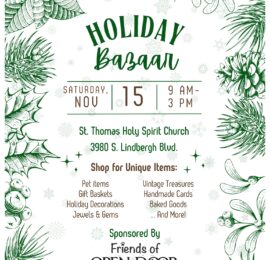 Kick off the holiday season with us at the Holiday Bazaar, sponsored by Friends of Open Door Animal Sanctuary! 📍 St. Thomas Holy Spirit Church3980 S. Lindbergh Blvd.🗓️ Saturday, November 15🕘 9:00 AM – 3:00 PM ✨ Shop for Unique Items: Pet Items & Gift Baskets Holiday Decorations & Handmade Cards Vintage Treasures, Jewels & Gems Delicious Baked Goods … and more! This festive market is the perfect place to find one-of-a-kind holiday gifts while supporting a great cause. Bring your family, friends, and holiday spirit—we can’t wait to see you there! 🎁💚