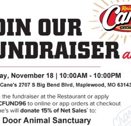 Join Us for a Raising Cane’s Fundraiser! Visit Raising Cane’s at 2707 S Big Bend Blvd, Maplewood, MO on Tuesday, November 18, from 10 AM–10 PM and mention Open Door Animal Sanctuary (or use code RCFUND96 for online/app orders). Cane’s will generously donate 15% of net sales to support our mission of providing loving care and second chances to more than 350 cats and dogs every day. Enjoy a delicious meal and make a difference—one bite at a time! 🐶🐱