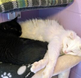 Just LOOK at these two. Really. Have you ever seen a more stylish pair? They're like the fashion statement of the year! Dante is all-black, petite, with a little round face and startling amber eyes. Snow is all-white, fluffy, with a long and elegant build and a little pink nose. I mean, they're such a perfectly matched pair that someone should probably write an animated Pixar short about them as a pair of good-natured buddy cops, fighting crime through community outreach. As you can probably tell, Dante and Snow are a bonded pair. They've grown up together, they love each