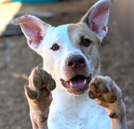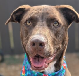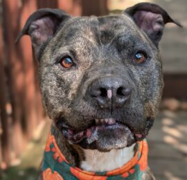 Cheeeeeese! Wanna be my friend? We can do EVERYTHING together! My name is Bandit, but it's kinda a misnomer because bandits are criminals and I'm a law-abiding citizen and also a gentleman and a scholar. One thing I've learned is that, if you're a beefy boy like me, you've gotta be extra-gentle. I'm like 80 lb of muscle. I'm big and strong, but my strongest muscle is my heart! I love attention and being close to people. I gotta warn you- I'm a kisser! Sure, I can be a boisterous goofball. I'm eight years old, but you'd never know it