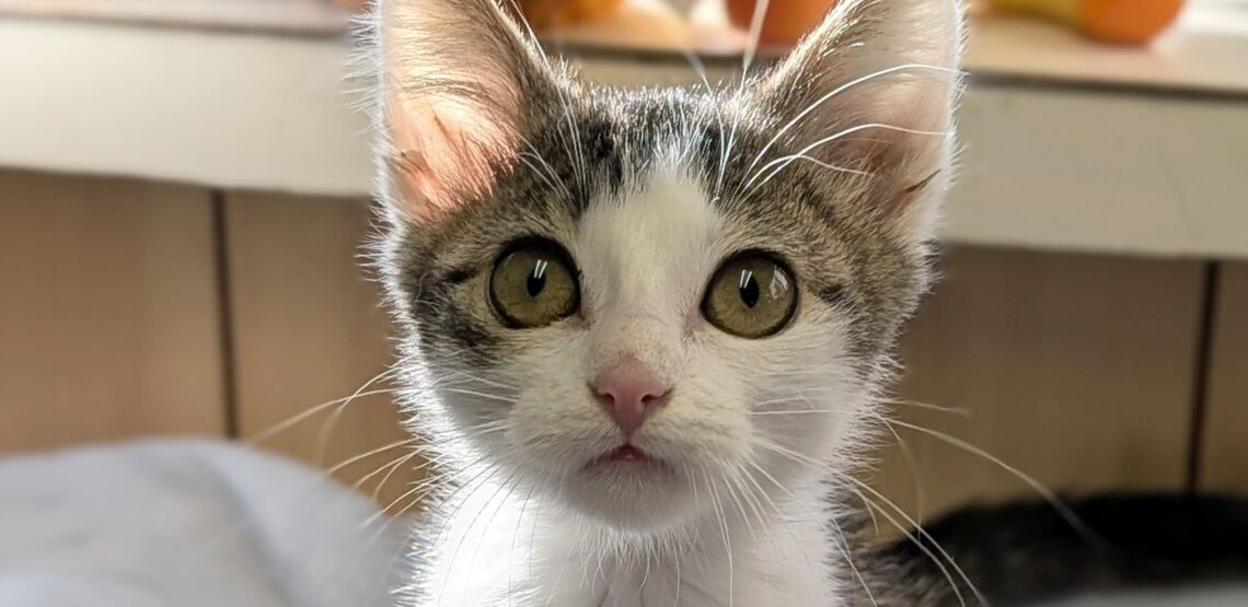 Ryot is 11 weeks old and ready to find a permanent home! She’s a girl who knows what she wants… and what she wants is to be INVOLVED. She would like to be held at all times, please and thank you. She would like to be with you while you cook, while you read, while you sleep, and while you work. Ryot is six tons of personality packed into a little two-pound body. She’d love another cat to play with and could go with a calm/quiet dog (she doesn’t love when her canine foster siblings move too fast or make too much noise, but otherwise ignores them). If you want a baby who REALLY wants to be your baby, come check her out! Her name is Ryot, she’s 11 weeks old, and she’s up to date on shots, negative for FIV and feline leukemia, and dewormed for intestinal parasites. She will have to return to the shelter in about a month for her spay, the cost of which is covered in the regular adoption fee ($150 for kittens).